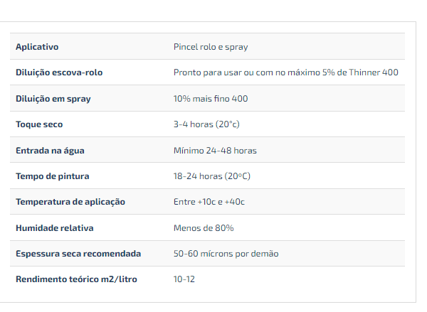 Anti-incrustante autopolinte, formulado com sais de cobre, utilizável em embarcações de madeira, ferro e fibra de vidro de média velocidade até 30 nós. Recomendamos a aplicação de pelo menos 2 demãos do produto.