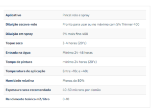 Observações. Os valores indicados nesta ficha técnica podem sofrer ligeiras variações de uma produção para outra. O produto aplicado não deve ser colocado em contato com água, produtos químicos ou submetido a esforços mecânicos antes da reticulação completa. As espessuras de filme úmido são para o produto não diluído. Com a diluição, esse valor aumentará. As informações acima são o resultado de testes laboratoriais precisos e experiências práticas, no entanto, dado que o produto é utilizado principalmente fora do controle do fabricante, o fabricante só pode garantir a sua qualidade contínua. A informação contida nesta ficha poderá estar sujeita a revisão por parte da Empresa. Para esclarecimentos, atualizações ou mais informações recomendamos entrar em contato diretamente com o fabricante. Isso cancela e substitui qualquer anterior.