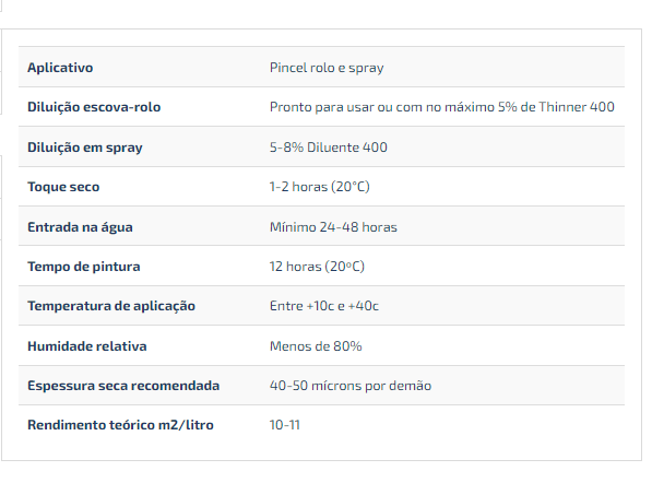 Anti-incrustante autopolinte formulado com tiocianato de cobre, utilizável em todos os tipos de embarcações, inclusive aquelas de alumínio e ligas leves. Recomendado para lanchas de média velocidade até 30 nós. Recomendamos a aplicação de pelo menos 2 demãos do produto.